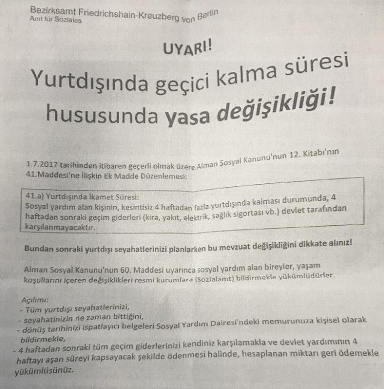 Berlin’in bulunanFriedrichshain-Kreuzberg Belediyesi skandal bir karar aldı. Kentte yaşayan ve sosyal yardım alan Türkiye kökenlilere Türkçe mektup göndererek yurt dışında 4 haftadan fazla kalmamaları konusunda uyardı.