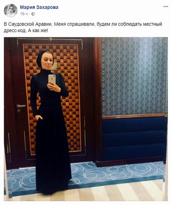 Gerçekleştirdiği dış geziler sırasında beklenmedik çıkışlarıyla adından söz ettiren Zaharova, Suudi Arabistan gezisinde de kıyafetiyle sürpriz yaptı. Arabistan gezisine kıyafet olarak önceden hazırlandığı her halinden belli olan Zaharova, Facebook hesabından bu fotoğrafları paylaştı. Fotoğrafların altına not da düşen Rusya Dışişleri Bakanlığı Sözcüsü "Suudi Arabistan’a ayak bastığımızda bana kıyafet konusunda kurallara uyup uymayacağımı sordular. Ben de elbette uyacağım dedim" satırları okundu.
