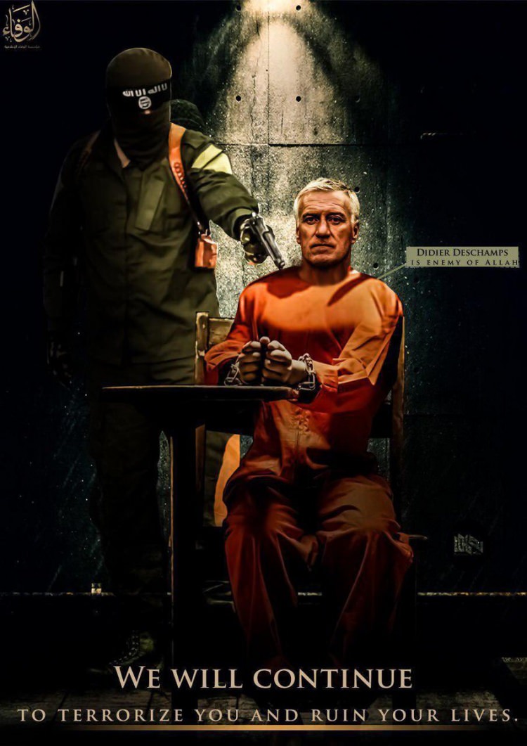 Örgütün internet sitesi ve sosyal medyasından yapılan görsel paylaşımlarda Fransa Milli Takımı'nı çalıştıran Fransız teknik adam Didier Deschamps, 'Allah'ın düşmanı' olarak ilan edildi. Paylaşılan görselde 'Hayatınızı mahvetmeye ve terörize etmeye devam edeceğiz' ifadeleri kullanıldı.