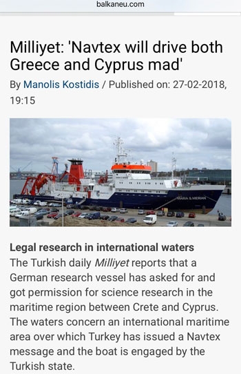 Alman bilimsel araştırma gemisinin Kıbrıs ile Girit arasında yapacağı araştırma faaliyeti için Türkiye’den izin istediğini, Türk deniz kuvvetlerinin de Navtex ilan ederek gemiye izin verdiğini duyurmuştu. Milliyet'in haberine göre, bu haberin ardından Yunan ve Rum basınında hükümetlerini eleştiren sert yazı ve karikatürler çıktı.
