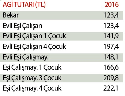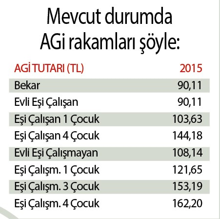1.300 TL olan asgari ücrete asgari geçim indirimi (AGİ) dahil edilmezse, bekar çalışanlar maaşlarına ek olarak 123 TL AGİ alacak. Bu tutar dört çocuklu ve eşi çalışmayan biri için 222 TL’ye ulaşacak.