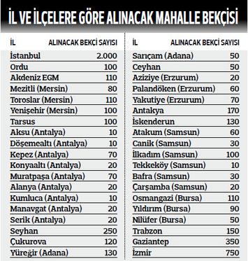 Bekçilerin hangi illerde görev yapacağı, işe alım şartlarının ne olacağı ise aylardır bekleniyordu. Nihayet beklenen açıklama geldi ve bekçi alımı için illerdeki valilikler birer birer ilana çıkmaya başladı. Bu çerçevede en fazla bekçi istihdamı sağlayacak il ise, İstanbul. İstanbul’daki 39 ilçeye toplam 2 bin çarşı ve mahalle bekçisi alınacak. Adana, İzmir, Antalya, Bursa, Gaziantep, Mersin, Hatay da bekçi alımı yapacak iller arasında. Bugüne kadar ise 6 bine yakın bekçi alımı için ilana çıkılırken, sene sonuna kadar da geri kalan kontenjanlar doldurulacak.