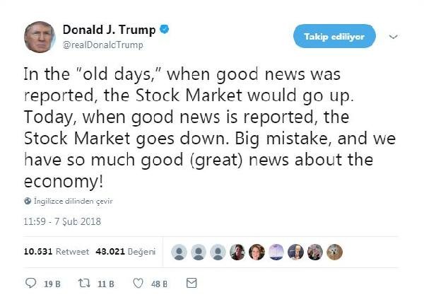 Trump Twitter’da yaptığı paylaşımda şu ifadeleri kullandı: “Eskiden iyi haberler aldığımızda hisse piyasaları yükselirdi. Şimdi ise iyi haber alınca piyasalar düşüyor. Büyük hata, hem de ekonomiyle ilgili onca iyi (harika) haber varken!”