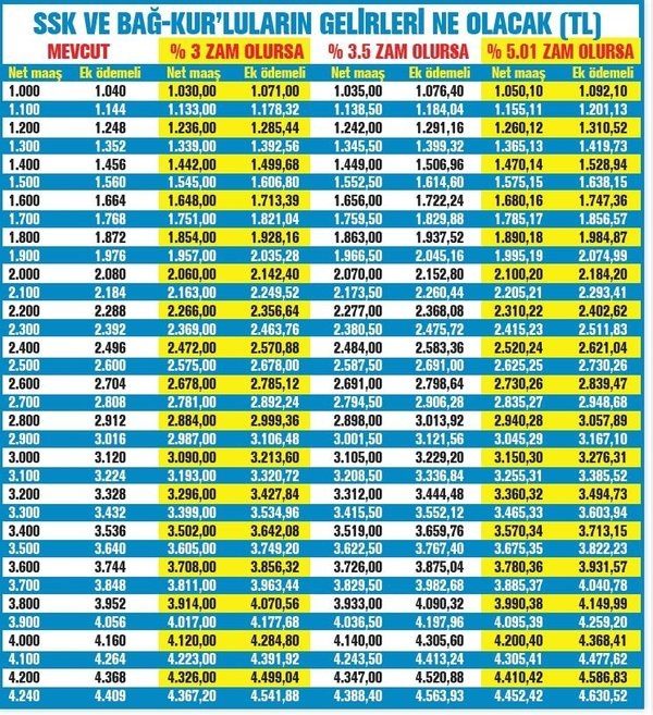 Halen en yüksek maaş 4 bin 240 lira. Bu maaşı alana her ay 169 lira da ek ödeme veriliyor. Yani ek ödemeyle birlikte emeklinin eline 4 bin 409 lira geçiyor. Eğer zam oranı yüzde 3 olursa, Ocak'ta net maaş 4 bin 367 liraya, ek ödeme de 174 liraya yükselecek. Böylece emeklinin geliri 132 lira artışla 4 bin 541 liraya ulaşacak. Ocak zammı yüzde 3.5 olursa; net maaş 4 bin 388 liraya, ek ödemeyle birlikte gelir de 4 bin 563 liraya çıkacak. Takvim'in haberine göre, emeklinin gelirinde bu formüle göre 154 lira artış yaşanacak. Zam oranının yüzde 5.1 olması halinde de net maaş 4 bin 452 liraya, ek ödeme de 178 liraya ulaşacak. Emeklinin eline bu durumda aylık 4 bin 630 lira geçecek. Yaşanacak artış 221 lirayı bulacak.