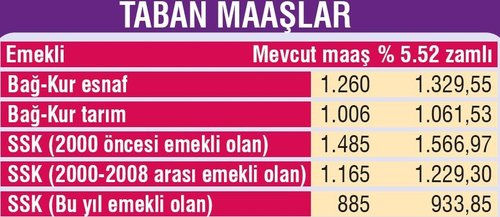 Eğer Ocak zammı yüzde 5.52 olarak gerçekleşirse, en düşük maaş; esnaf emeklilerinde bin 260 liradan bin 329 liraya, Bağ-Kur tarım emeklilerinde bin 6 liradan bin 61 liraya, 2000'den önce emekli olan SSK'lılarda bin 485 liradan bin 566 liraya, 2000-2008 arası emekli olan SSK'lılarda ise bin 165 liradan bin 229 liraya ulaşacak. En yüksek emekli aylığı da 4 bin 240 liradan 234 lira artışla 4 bin 474 liraya yükselecek.