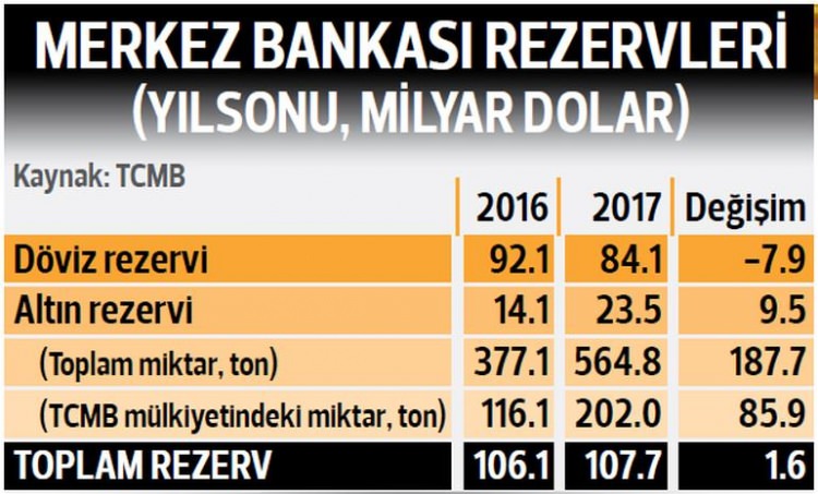 Merkez Bankası rezerv politikasıyla yıllarca hiç değiştirmeden 116 tonda tuttuğu kendi mülkiyetindeki altın rezervlerini, mayıs ayından itibaren arttırmaya başlamıştı; döviz rezervlerinden yaklaşık 5 milyar dolarlık bölümünü altına çevirerek 2017 sonunda 202 tona ulaşmış oldu.