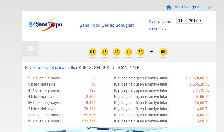 Milli Piyango İdaresi Genel Müdürlüğünce düzenlenen Şans Topu oyununun 816. hafta çekilişi yapıldı. Çekiliş sonucu bu haftanın kazandıran numaraları 1, 13, 17, 19, 32 ve artı 8 olarak belirlendi. Çekiliş sonuçları itibarıyla Şans Topu oyununun bu haftaki çekilişinde 5 artı 1 bilen iki kişi, 337 bin 970 lira 80'er kuruş ikramiye kazandı. İşte Şans Topu çekiliş sonuçları hakkında tüm detaylar!