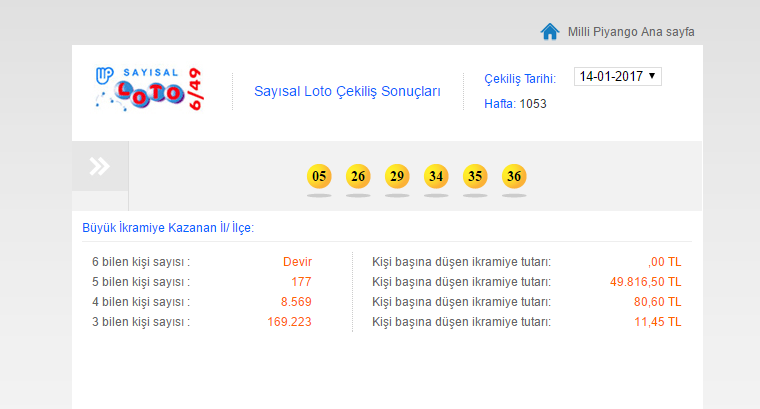 Milli Piyango İdaresince düzenlenen Sayısal Loto oyununun Bin 53'üncü hafta çekilişi yapıldı. Çekiliş sonucu bu haftanın kazandıran numaraları 5, 26, 29, 34, 35 ve 36 olarak belirlendi. Çekiliş sonuçları itibarıyla 4. kez 6 bilen çıkmayınca, oyun planı gereği büyük ikramiye 5 bilenler arasında dağıtıldı. Sayısal Loto çekilişinde bu hafta 5 bilen 177 kişi, 49 bin 816'şar lira kazandı.