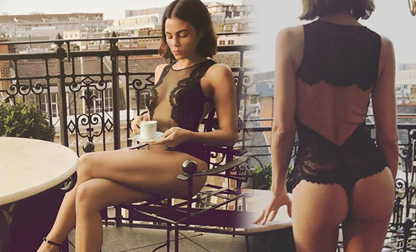 Dantel gövdeli mayo iç çamaşırı ile balkonda poz veren 36 yaşındaki güzel, 3 bin 385 TL değerindeki çamaşırı ile adeta gövde gösterisi yaptı.