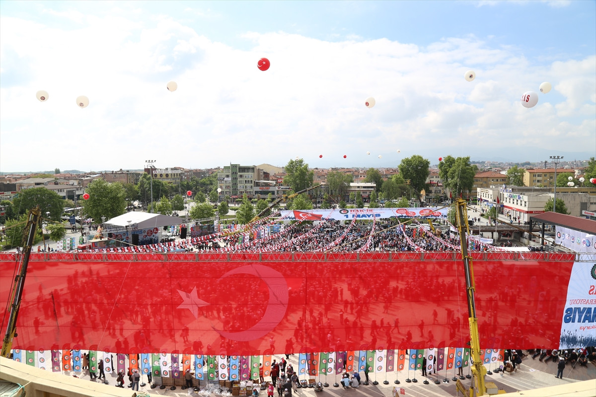 İl dışından 32 ilden Adapazarı'na gelen işçiler, kutlamaların yapılacağı Adapazarı Kent Meydanı'na gruplar halinde yürüyüşe geçti. Miting alanı dev Tük bayrağı ve sendika flamalarıyla donatıldı.