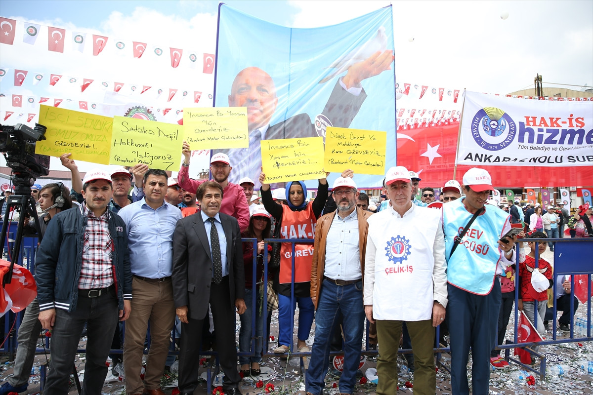 İşçilerin ellerinde "Beni sendikamdan ayırma", "Emeğe saygı insana saygı", "Anayasak değil Anayasa", "Teröre hayır", "5620 Sayılı Kanun kaldırılsın", "İşçi sendika omuz omuza" gibi pankartlar taşıdıkları görülürken, zaman zaman "İnadına HAK-İŞ, inadına sendika", "Yaşasın 1 Mayıs, yaşasın HAK-İŞ", "Taşeronun hakkı kadroda saklı", "Teröre hayır, kardeşliğe evet" sloganları atıldı.