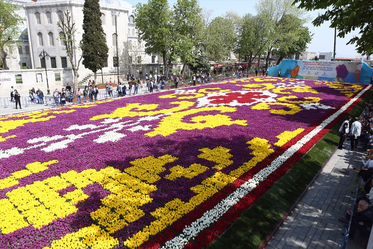 Sultanahmet Meydanı'ndaki canlı lale halısı 30 Nisan’a kadar tüm ziyaretçilere açık olacak.