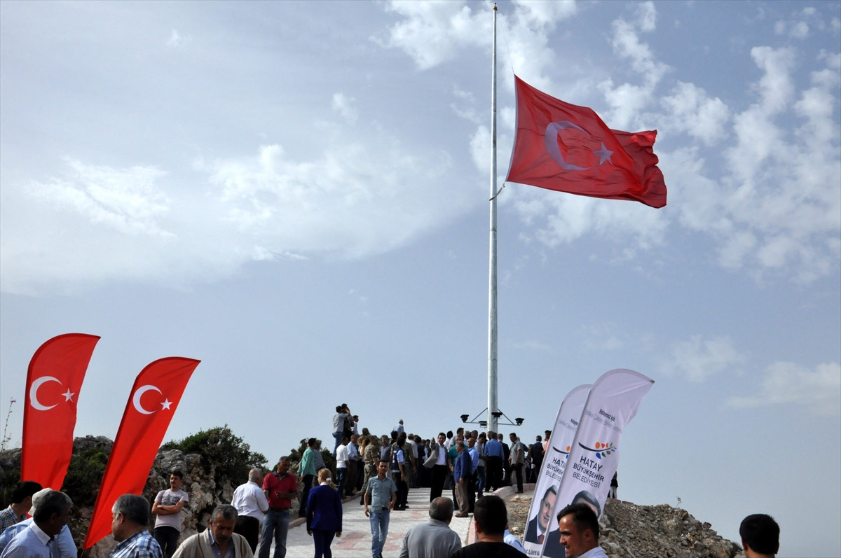 HATAY (AA) - Hatay Büyükşehir Belediyesi tarafından hazırlanan 12 metrekare büyüklüğündeki Türk bayrağı Antakya'da düzenlenen törenle göndere çekildi.