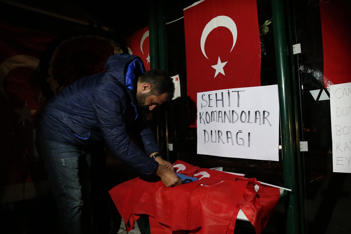 Türk bayraklarıyla donattıkları araçlarıyla, kornalar çalarak hain saldırının yaşandığı yere gelen vatandaşlar, şehit askerler için saygı duruşunda bulundu. İstiklal Marşı'nı okuyan grup, saldırıda şehit olanların isimlerini tek tek sayarak, "burada" diye bağırdı.