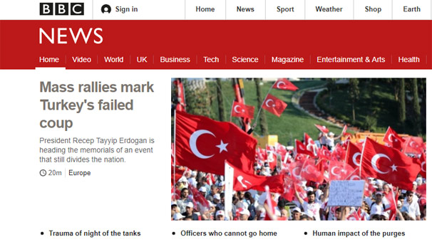 15 Temmuz Şehitler Köprüsü'e akın edenleri manşetine taşıyan BBC, 'Türkiye'deki darbe girişiminin yıldönümünde dev miting' başlığını kullandı, manşete ellerindeki Türk bayraklarını sallayan kalabalığın fotoğrafı eşlik ediyor.