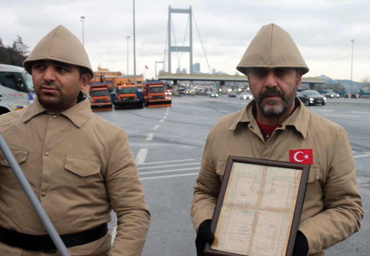 Saffet Güneş, arkadaşı Cemalettin Kaymakçı ile 15 Temmuz Şehitler Köprüsü'nün Anadolu yakası girişine geldi. Çanakkale Savaşı'na katılan askerlerin kıyafetinden giyen, ellerinde Türk bayrağı taşıyan Güneş ve Kaymakçı, 15 Temmuz'da şehit olanları andı.