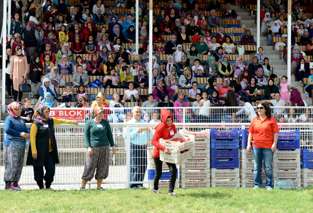 Karatepe Stadyumu'ndaki etkinlikte kadınlar arasında domates kasası taşıma, halat çekme, gözü kapalı domates yeme, "analı kızlı" basket atma gibi yarışlar düzenlendi.