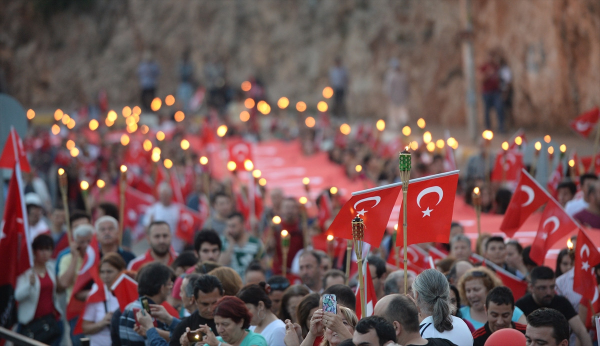 Varyantta toplanan binlerce insan, 400 metre uzunluğundaki Türk bayrağını açarak ellerinde fenerler ile 2 kilometre boyunca yürüdü.