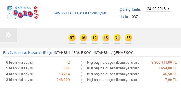 24 Eylül 2016 tarihli Milli Piyango'nun düzenlediği Sayısal Loto çekilişinde İstanbul'da yaşayan 2 kişi 6 rakamı bilerek ikramiyeyi paylaştı.