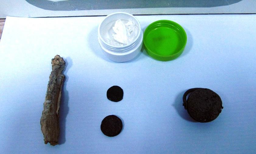 Kent merkezi girişinde durdurulan araçta yapılan aramada, bir krem kutusunun içinde yarım ay şeklinde mühür, 2 adet sikke ile 10 santimetre uzunluğunda demir obje bulundu.