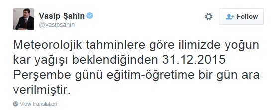 İstanbul Valisi Vasip Şahin alınan tatil kararıyla ilgili haberi Twitter hesabından duyurdu. Şahin, "Meteorolojik tahminlere göre ilimizde yoğun kar yağışı beklendiğinden 31.12.2015 Perşembe günü eğitim-öğretime bir gün ara verilmiştir" ifadelerini paylaştı. Tweet çok kısa sürede 10 bin retweet'e ulaştı.