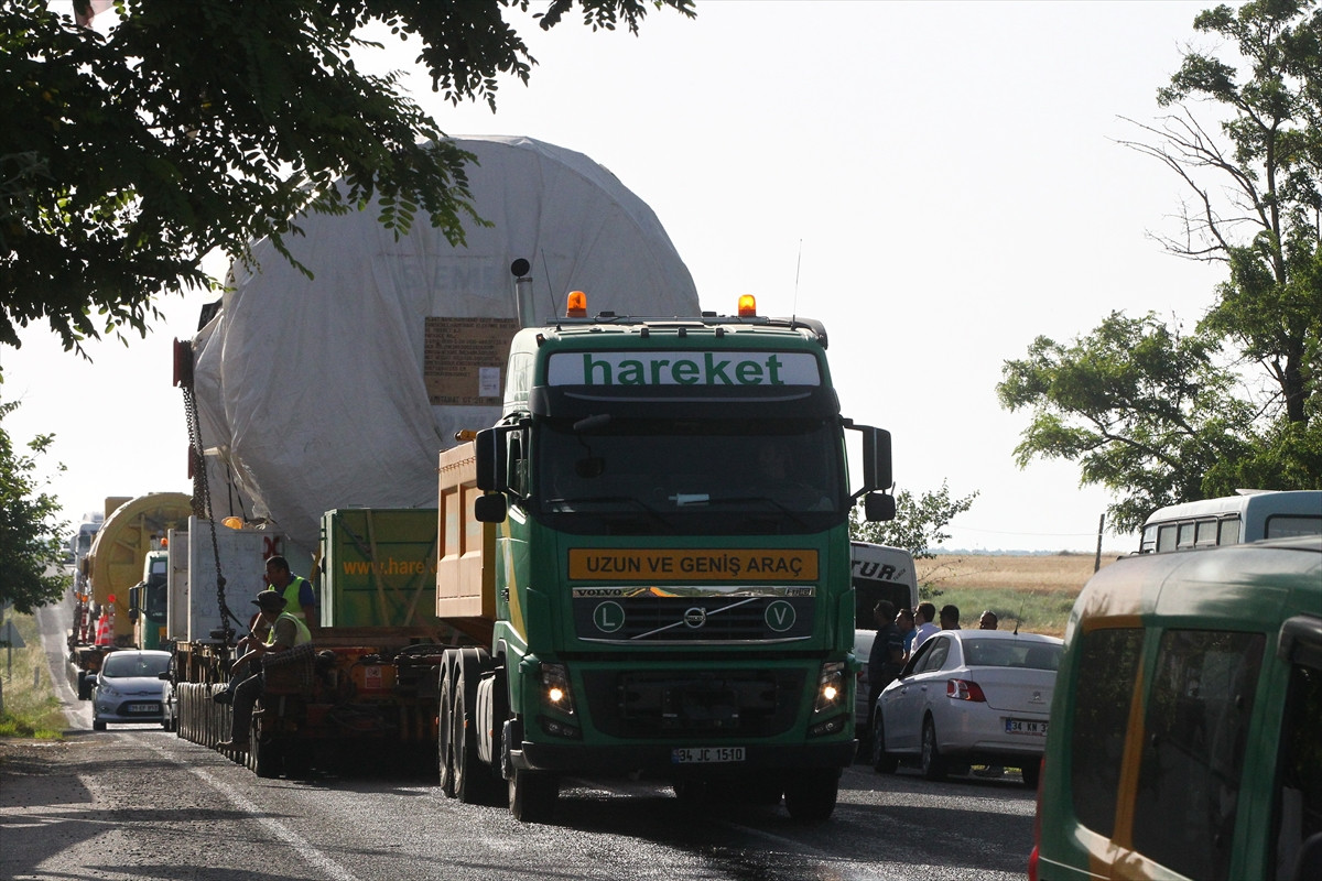 KIRKLARELİ (AA) - Kırklareli'nin Lüleburgaz ilçesinde bulunan Hamitabat Doğalgaz Kombine Çevrim Santralinde kullanılmak üzere Almanya'dan getirilen 480 ton ağırlığındaki doğalgaz türbini, 240 tekerleği bulunan tır ile taşınıyor.