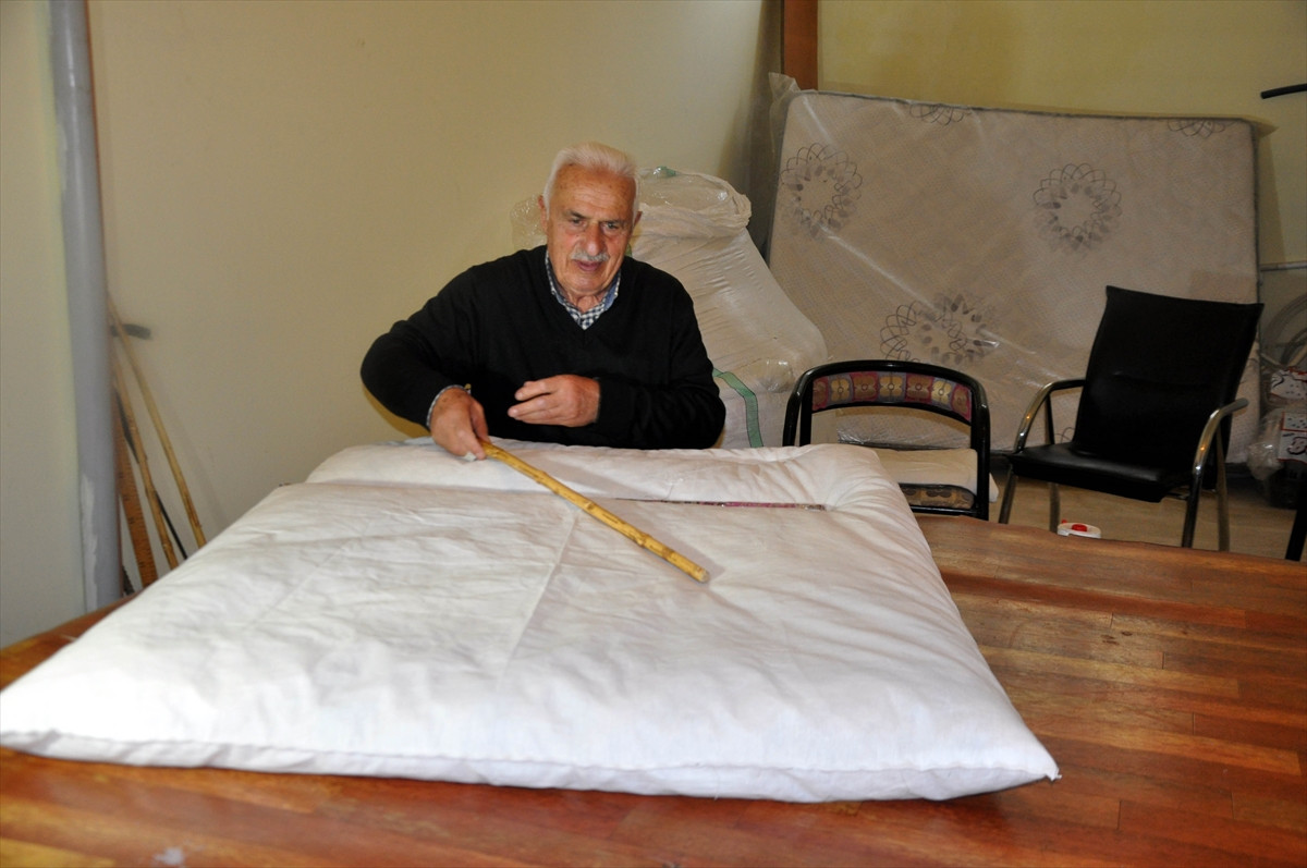 Yaklaşık 60 yıl önce Muş'a yerleştikten sonra yorgancı dükkanı açtığını ve oğlu Nazım ile çalıştığını ifade eden Bayram, iğnesini elinden hiç düşürmediğini söyledi.