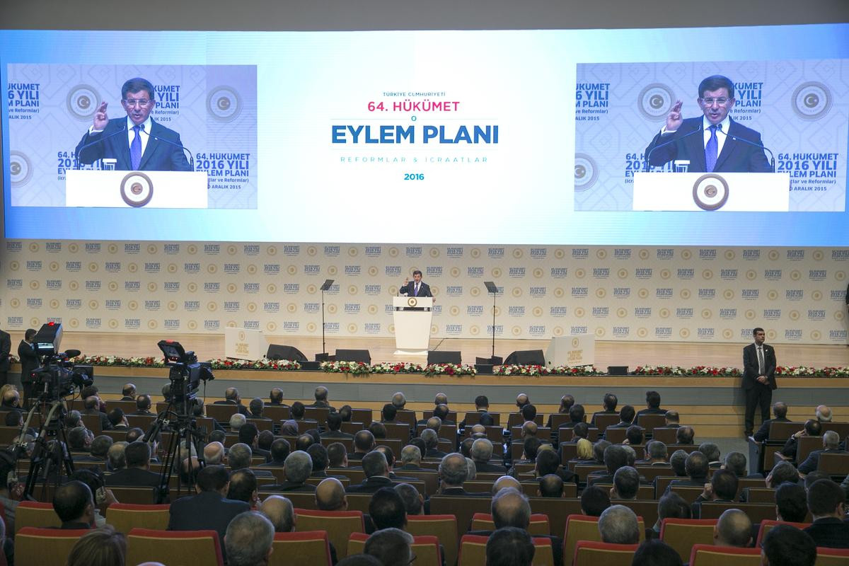 Bu vaatlerin dışında üzerinde çok titizlikle çalışılmış reform paketlerinden oluşan bir eylem planı da hazırladıklarını belirten Davutoğlu, "Reformlardan sorumlu Başbakan Yardımcımızın koordinatörlüğünde bütün bakanlıklarımızla ve kurumlarımızla iş birliği ve istişareyle 2016 yılı için 1 ve 3 aylık ile 1 yıllık dönemleri içeren kapsamlı bir eylem planı taslağı hazırladık. AK Parti hükümeti reformlar yapan, reformlar vadeden bir hükümet olacak. Statüko bizim iktidarımızı rehin alamayacak ve hiçbir zaman kendi siyaset geleneğimizin statik hale gelmesine, hareket kabiliyetini yitirmesine fırsat vermeyeceğiz. Dogmatik tabularla ve ön yargılarla devlet yönetilmez. Kamu yönetimimizi toplumun talepleri, vatandaşların ihtiyaçları ve güçlü demokrasi istikametinde yenileyecek reformlar yapacağız" değerlendirmesinde bulundu.