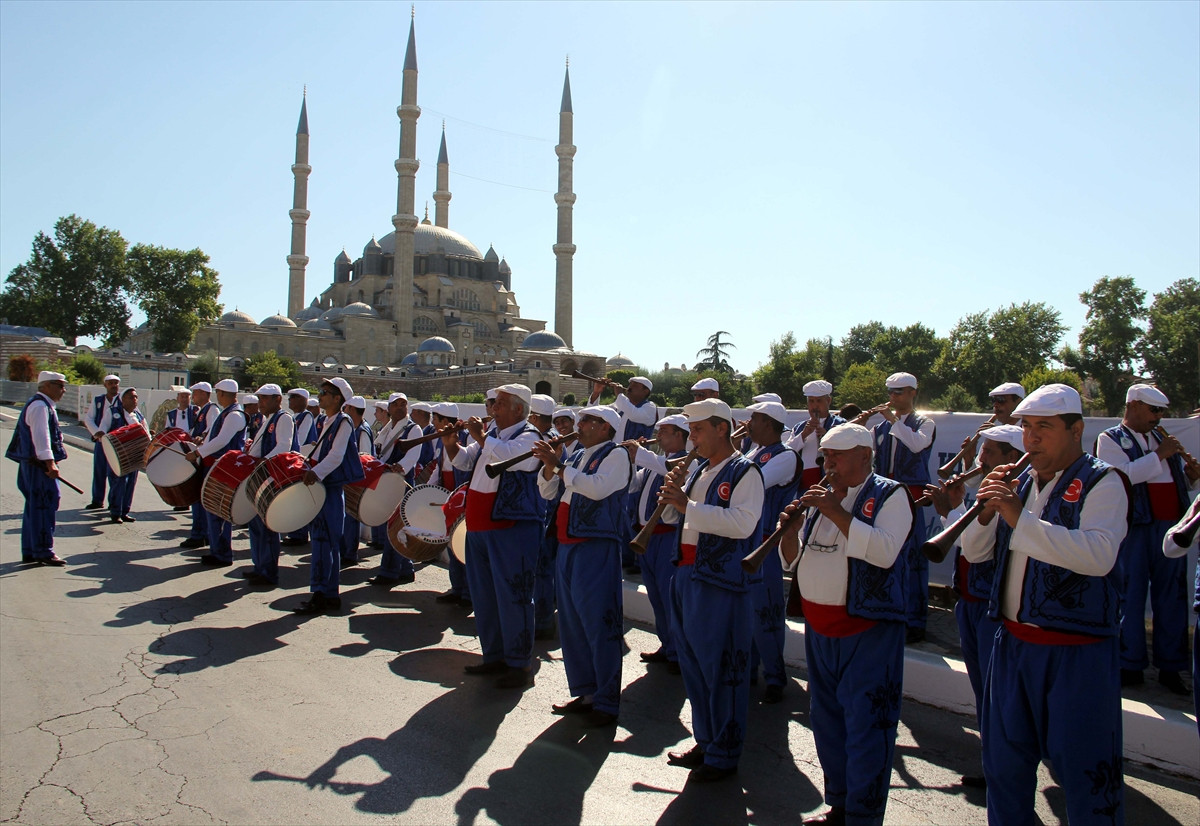 Geleneksel kıyafetleriyle Kırkpınar güreş havalarını çalarak esnaf ve vatandaşları güreşlere davet eden Kırkpınar Davul Zurna ekibi, Edirne Belediyesi önüne geldi.