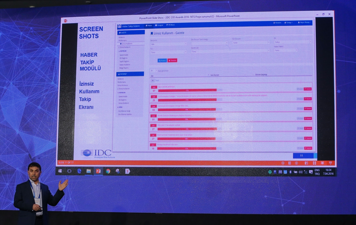 Yakup Şıvka, İzmir'in Çeşme ilçesinde, ABD merkezli market araştırmaları şirketi International Data Corporation (IDC) tarafından düzenlenen 7. IDC CIO Turkey Summit 2016 kapsamında, 2016'nın "En Yenilikçi Projesi" ve "En İyi BT ile Kurumsal Hedeflere Katkı Sağlama Projesi" kategorilerinde dereceye giren ve ödüle layık görülen AA'nın Haber, Fotoğraf Takip ve Analiz Sistemi'yle ilgili sunum gerçekleştirdi.