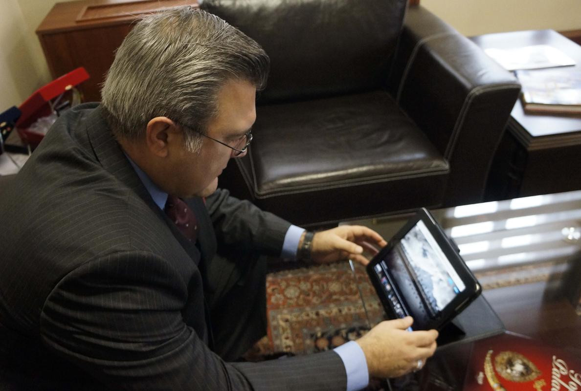 Büyükelçi Yörük, makamında, AA foto muhabirlerinin yurtiçi ve yurtdışında çektiği fotoğrafları inceledi.