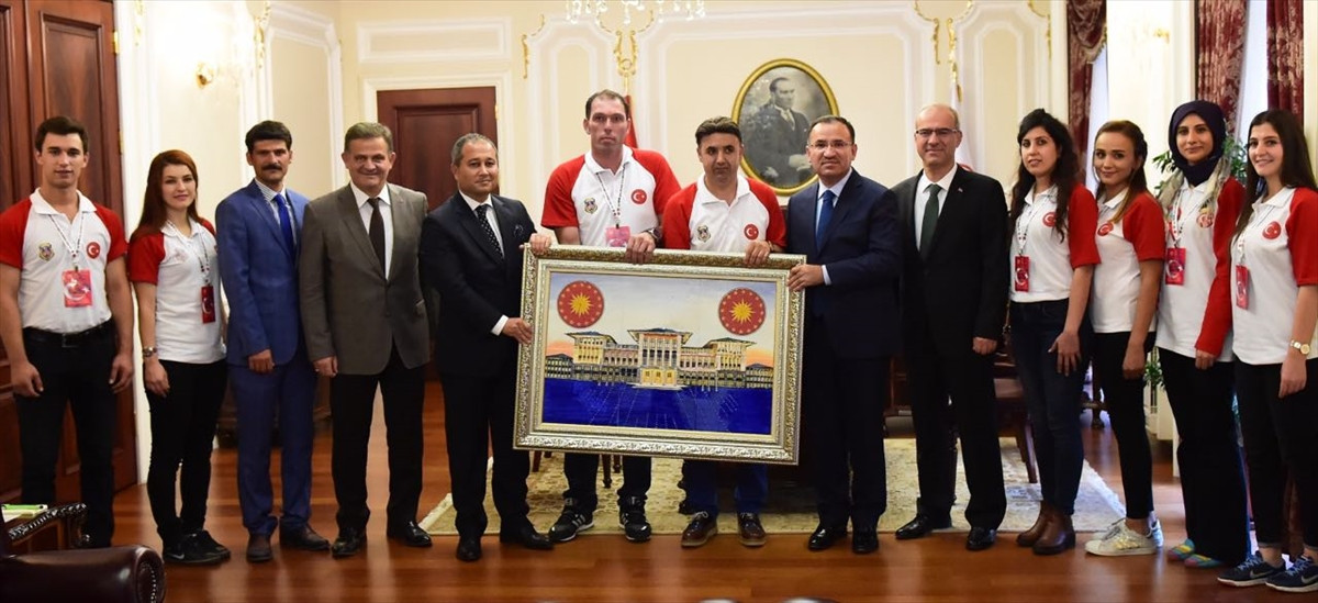 ANKARA (AA) - Adalet Bakanı Bekir Bozdağ'a, "13. Ankara İşyurtları Ürün ve El Sanatları Fuarı"nı düzenleyen heyeti kabulünde, cezaevinde hükümlüler tarafından yapılan Cumhurbaşkanlığı Külliyesi'nin tablosu hediye edildi.
