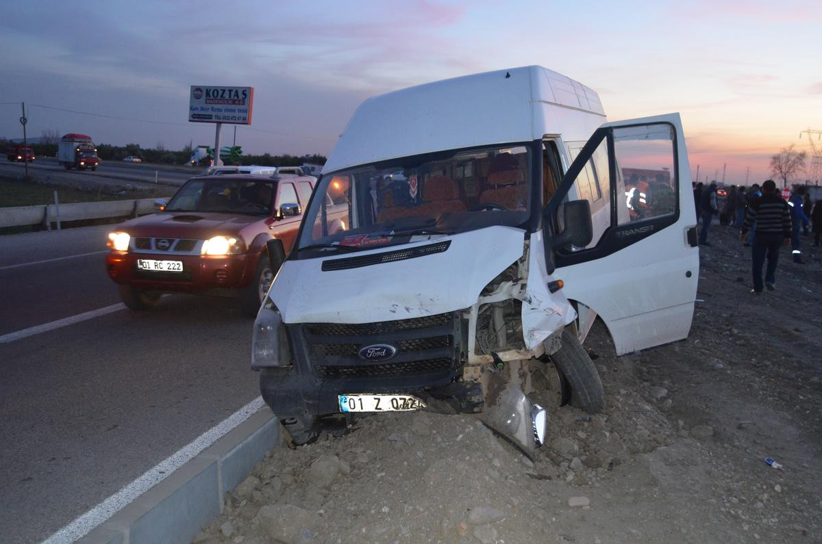 Alınan bilgiye göre, Adana-Kozan Karayolu, Mansurlu-Yahyalı kavşağında, Hüseyin Demirci (40) yönetimindeki 01 Z 0724 plakalı yolcu minibüsü ile Kazım Avcı'nın kullandığı 42 DJU 07 plakalı otomobil çarpıştı.