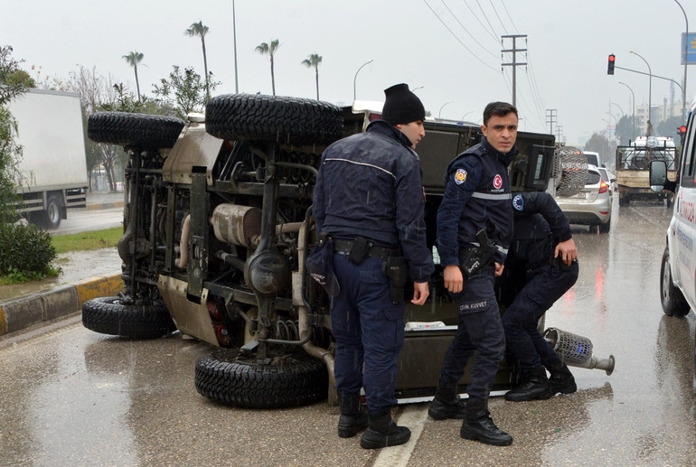 Adana'da zırhlı aracın devrilmesi sonucu 3 polis memuru yaralandı. Alınan bilgiye göre, zırhlı polis aracı, Tarsus-Adana-Gaziantep Otobanı Sarıçam mevkisinde devrildi. Araçtaki polis memurları Hakan Seçkin, Nihat Şener ve Mehmet Oflaz yaralandı. Yaralı polis memurlarından Seçkin ve Şener Çukurova Üniversitesi Tıp Fakültesi Balcalı Hastanesi, Oflaz ise Adana Numune Eğitim ve Araştırma Hastanesine kaldırıldı. Yaralı polislerin sağlık durumunun ciddiyetini koruduğunu bildirildi. Kazanın ardından polis telsizinden yaralı polisler için kan anonsu yapıldı. Adana Emniyet Müdürü Cengiz Zeybek, yaralı polislerin durumu hakkında bilgi almak üzere Çukurova Üniversitesi Tıp Fakültesi Balcalı Hastanesine geldi.
