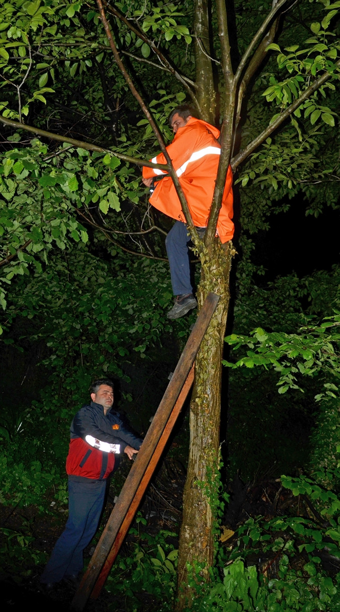Belirtilen yere gelen ekipler ağaca çıkarak kediyi kurtarmaya çalıştı. Rüzgar ve yağmurun etkisiyle kediye ulaşmakta güçlük çeken ekipler, testere ve halat yardımıyla dalı eğerek kediyi kurtardı.