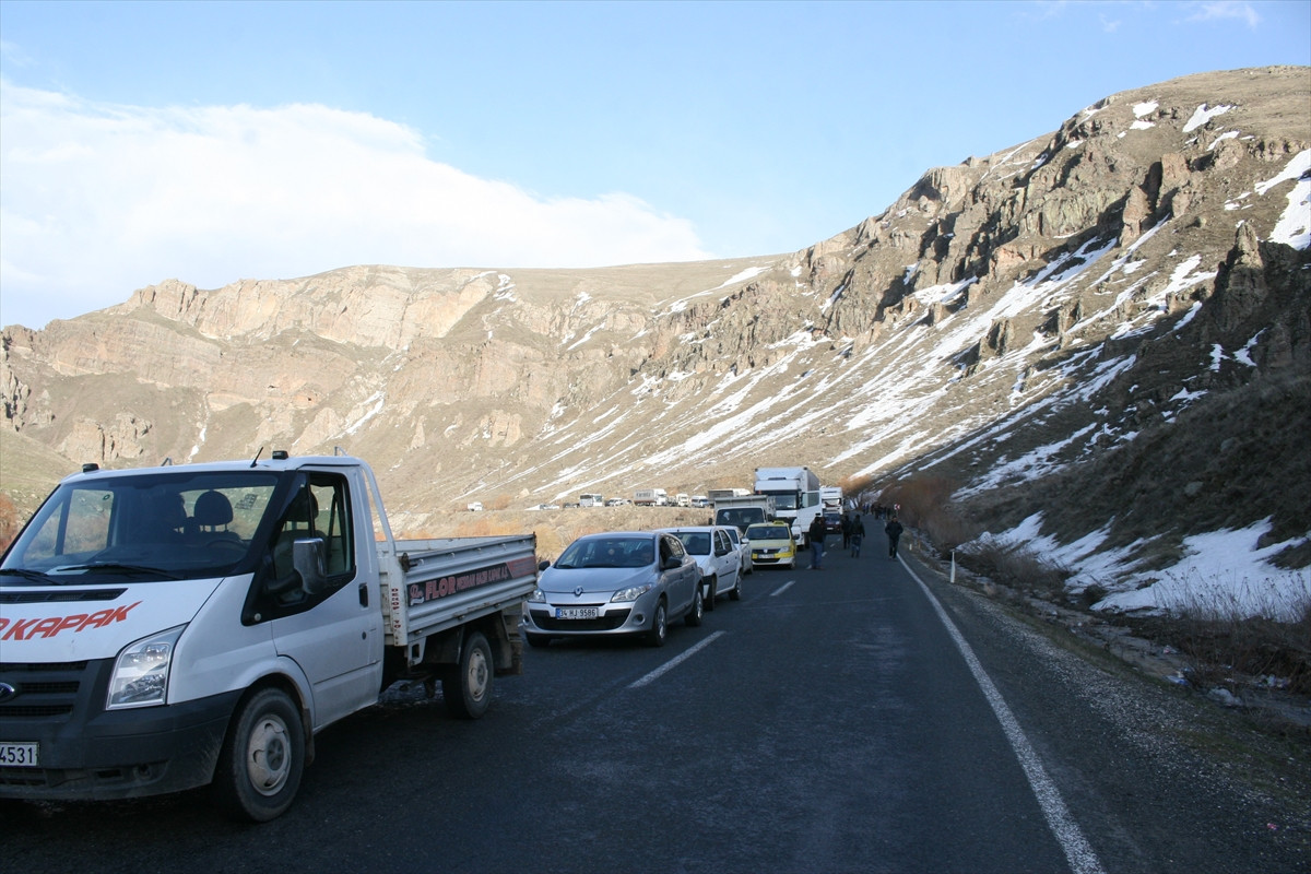 Yaklaşık 6 kilometrelik araç kuyruğu oluşan yolda araç sürücüleri, yolcular ve içinde hasta bulunan bir ambulans yolun trafiğe açılmasını bekledi.