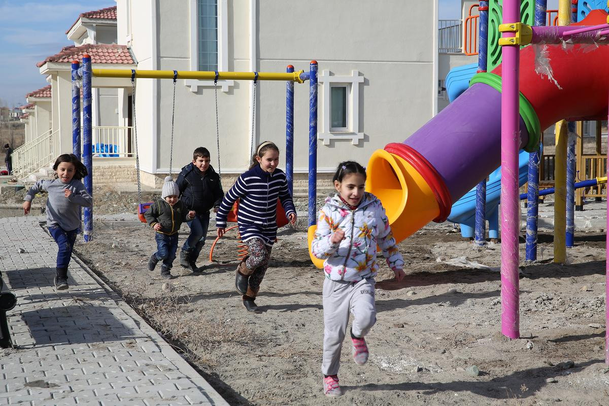 Aile büyüklerinin yeni evlerini tanımaya ve alışmaya çalıştığı gözlenen iskan bölgesinde, çocuklar ise hallerinden mutlu şekilde çocuk parklarına koşarak, salıncaklara binip kaydıraklardan kaydı.
