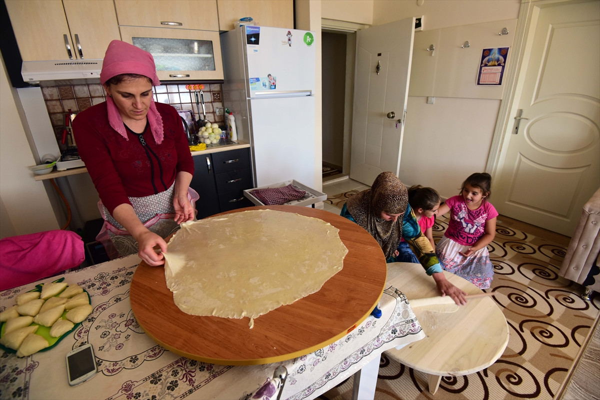 İlçede yerleştirildikleri konutlarda bayram için hummalı şekilde hazırlık yapan Ahıskalı kadınlar, bayramda ziyaretlerine gelecek misafirlere ikram etmek için çeşitli tatlılar, hamur işleri ve yemekler hazırlıyor.