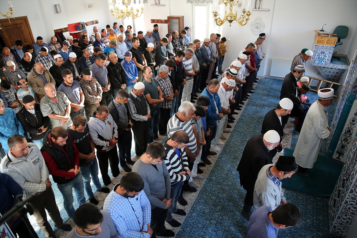 Öncesinde cami hocası tarafından verilen Kurban Bayramı konulu vaazı dinleyen Ahıska Türkleri, bayram namazını kılarak dua etti.