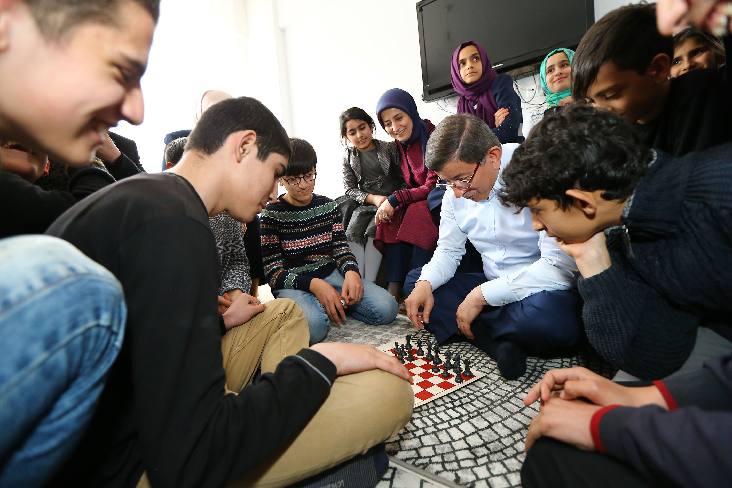 Başbakan Ahmet Davutoğlu ve eşi Sare Davutoğlu, Bingöl'de sevgi evinde kalan çocuklarla bir araya geldi. Çeşitli açılış ve etkinliklere katılmak üzere kentte bulunan Davutoğlu, eşi Sare Davutoğlu ve diğer ilgililerle, 13-18 yaş aralığındaki 40 çocuğun kaldığı sevgi evini ziyaret etti. Ziyaretinde çocuklarla yakından ilgilenen Davutoğlu, 8'inci sınıf öğrencisi Erkan Koşar ile satranç oynadı. Oyun esnasında Başbakan Davutoğlu'na sık sık 'hocam' diye hitap eden Koşar, oyunun başında uyguladığı stratejinin Davutoğlu'nun hamleleriyle bozulması üzerine "Planım bozuldu" diyerek, ziyarete katılanları güldürdü. Kurum içi turnuvada derecesi bulunan Erkan Koşar oyunu zor da olsa kazanırken, galibiyetini Davutoğlu'na sarılarak kutladı. Başbakan Davutoğlu ve eşine ziyarette Aile ve Sosyal Politikalar Bakanı Sema Ramazanoğlu, Kalkınma Bakanı Cevdet Yılmaz, Gençlik ve Spor Bakanı Akif Çağatay Kılıç da eşlik etti.