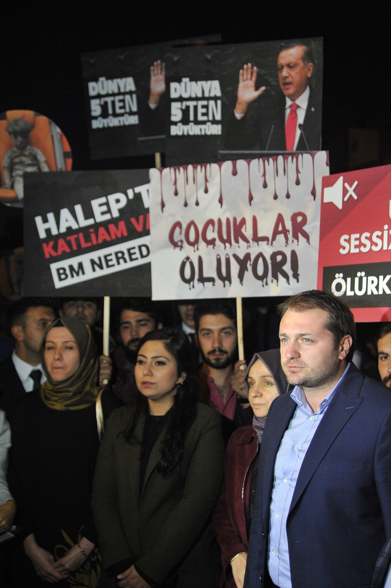 Ellerinde "Çocuklar ölüyor", "Çocuklar uyurken sessiz olunur, ölürken değil" ve "Halep'te katliam var, BM nerede" yazılı dövizler taşıyan grup, akşam saatlerinde BM binası önünde toplandı.