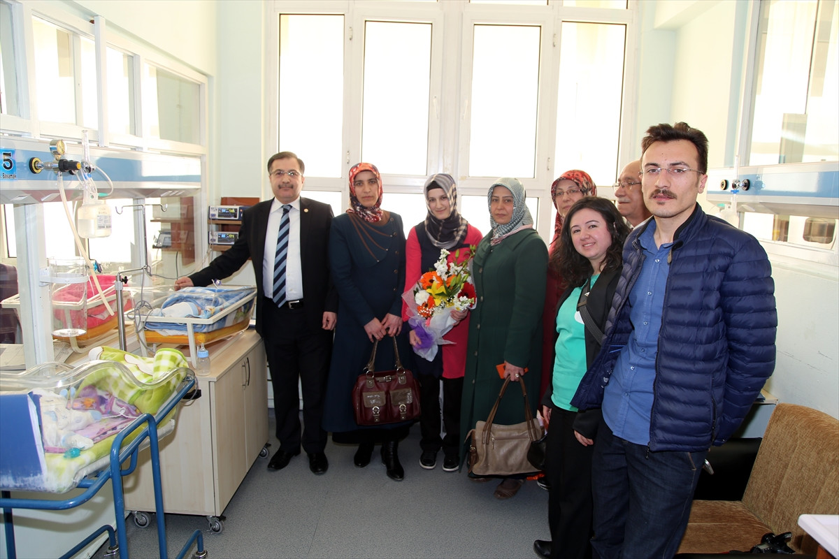 Şahin, Cumhuriyet Üniversitesi (CÜ) Sağlık Hizmetleri Uygulama ve Araştırma Hastanesi Yenidoğan Yoğun Bakım Servisindeki ziyarette anne Bozkurt'u tebrik ederek, bebeklerin isimlerine yakışır birer devlet adamı olmalarını diledi.