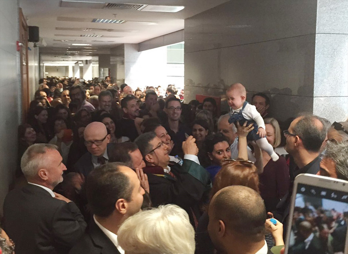 Bu arada, akademisyenlere destek için Çağlayan'daki İstanbul Adalet Sarayı önünde toplanan grup, Ferhat Tunç ve CHP Hatay Milletvekili ve Grup Yorum eski solisti Hilmi Yarayıcı'nın şarkılarıyla halay çekti, horon tepti.