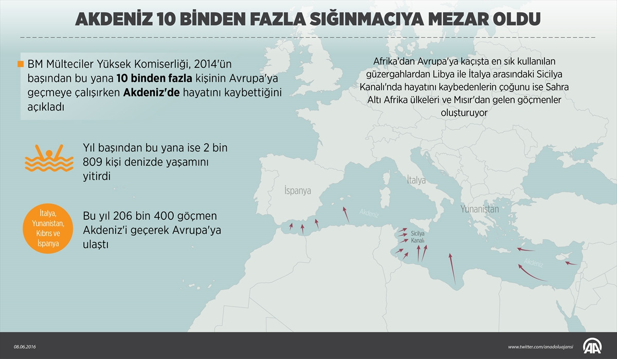 CENEVRE (AA) - Birleşmiş Milletler Mülteciler Yüksek Komiserliği (BMMYK), 2014'ün başından bu yana 10 binden fazla kişinin Avrupa'ya geçmeye çalışırken Akdeniz'de hayatını kaybettiğini açıkladı.