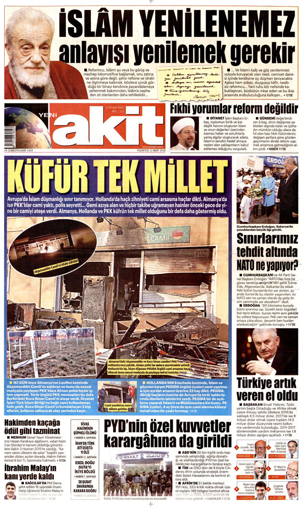 Hükümete yakın Yeni Akit gazetesi bugünkü sürmanşetinde Erdoğan’a Necip Fazıl’ın sözleriyle yanıt verdi. Akit “İslam yenilenemez anlayışı yenilemek lazım”haberinde Necip Fazıl’ın bir yazısına yer verdi.