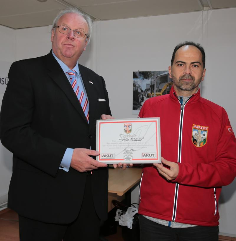 Konuşmaların ardından Mahruki, Alman Büyükelçisi Erdmann'a teşekkür belgesi takdim etti. Büyükelçi Erdmann, AKUT'un lojistik merkezini gezerken, K9 Köpekli Arama Birimi'nin arama-kurtarma tatbikatını da izledi.