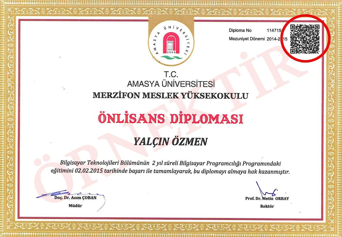 Amasya Üniversitesinde diplomalara entegre edilen özel tasarlanmış karekod sayesinde diplomaların güvenliğinin sağlanarak, olası sahteciliklerin engellenmesi, öğrencinin diplomasının doğruluğunun teyidi için harcanan zamanın önüne geçilmesi hedefleniyor.