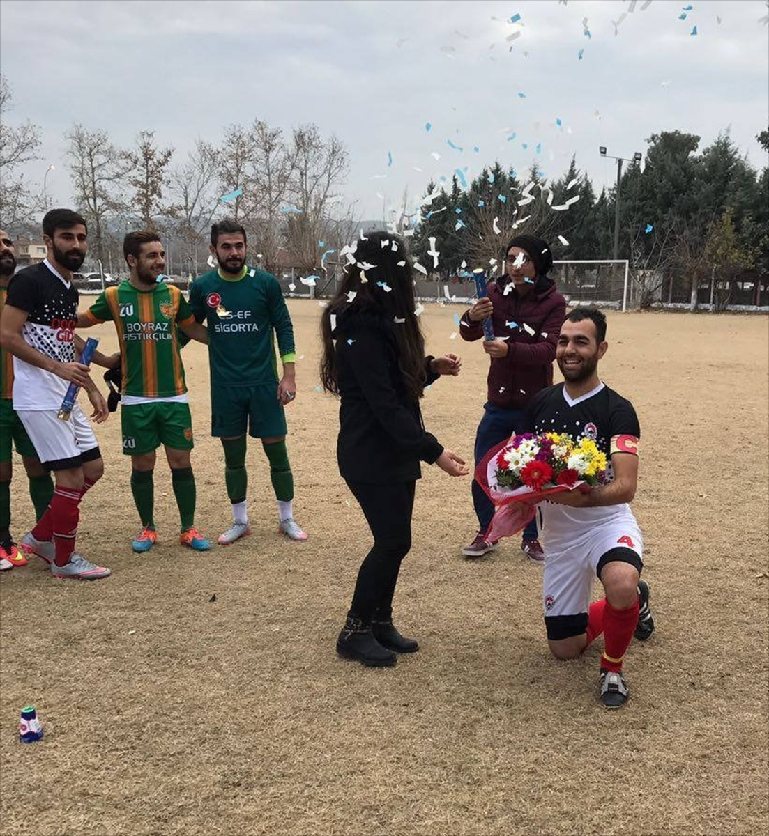OSMANİYE (AA) - Osmaniye'de oynanan amatör maçta Toprakkale Gençlerbirliği futbolcusu Arif Rişmanlıoğlu, tribünde kendisini izleyen kız arkadaşına sürpriz evlilik teklifi yaptı.