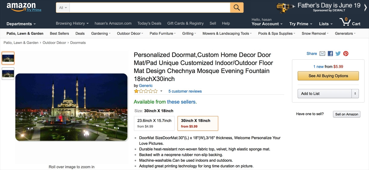 Amazon, Rocky Bull firmasınca siteye eklenen İslamiyet, Hristiyanlık ve Hindu inançlarına ait fotoğraflardan yapılan tüm kapı paspaslarının satışına son verdi. Bunlar arasında Ayasofya ve Sultan Ahmet camilerinin yanı sıra diğer ülkelerden camiler de var. Camili olanlardan birinde Ayasofya'nın içindeki "Osman" ve "Hüseyin" yazan levhalar da görülüyordu.