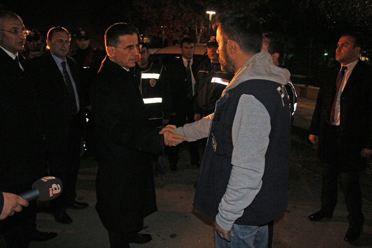 Vali Ercan Topaca, asayiş uygulaması yapan polislerle tokalaşarak denetimler hakkında bilgi aldı.